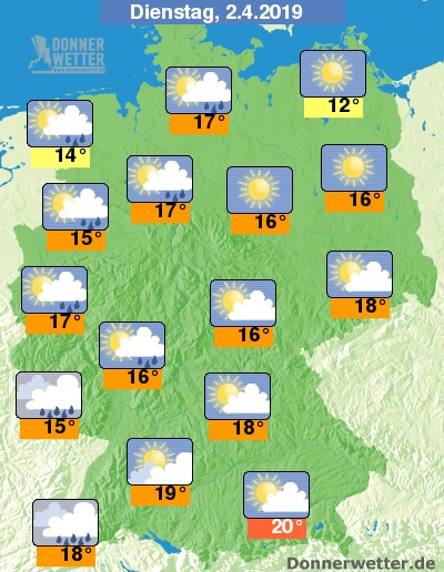 Die Höchsttemperaturen erreichen nochmals Werte zwischen 12 Grad an der Ostsee und 20 Grad in Bayern.