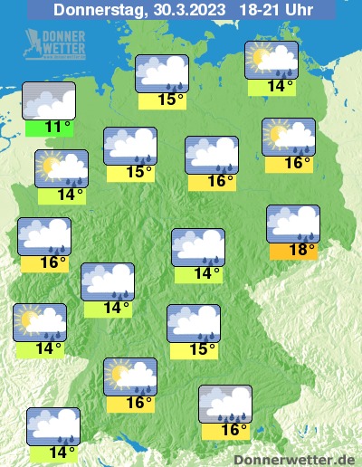 Heute Abend ziehen oft dichte Wolken durch, dazwischen kann es aber vor allem nach Westen hin auch längere Zeit aufheitern. Es bilden sich besonders über der Südosthälfte zeitweise Schauer, örtlich auch Gewitter. Die Temperatur liegt bei 11 Grad in Cuxhaven und bis 18 Grad in Dresden.