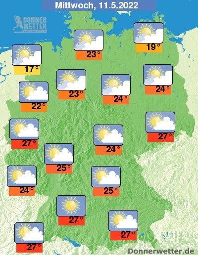 Am Mittwoch ist es über dem Norden teils locker, teils stark bewölkt, dazu sind nur vereinzelte Schauer möglich. Im Rest der Republik ist es verbreitet heiter oder sonnig, dabei bleibt es weitgehend trocken. Die Temperatur steigt auf eher kühle 17 Grad an der Nordsee und bis 27 Grad im Alpenvorland, An der Nordsee weht zudem ein oft stürmischer Wind.