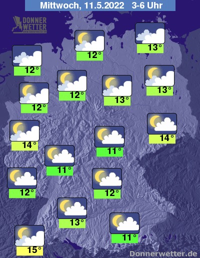 In der Nacht zum Mittwoch ist es über dem Norden aufgelockert bis stark bewölkt und dazu weitgehend trocken. Weiter nach Süden hin ist der Himmel häufig locker und sonst wechselnd bewölkt, dazu bleibt es trocken. Die Temperatur sinkt auf milde 15 Grad im Breisgau und bis 11 Grad im Grabfeld.