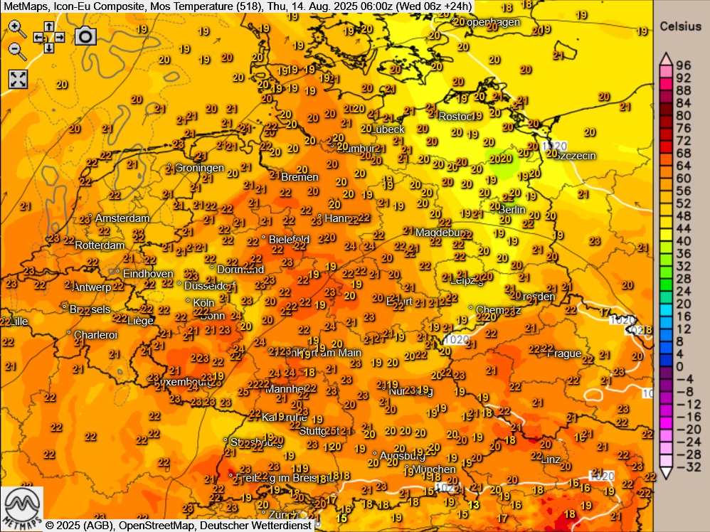 Erneut vielerorts tropische Augustnacht mit Tiefstwerten nicht unter 20 Grad.