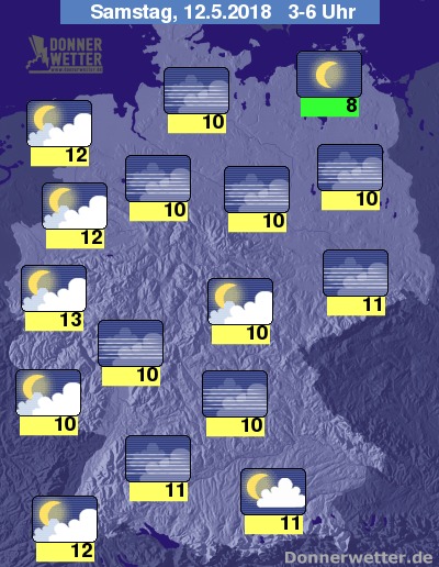 In der kommenden Nacht ist der Himmel über dem Land zum Großteil sternenklar, westlich des Rheins ziehen allerdings vielerorts mehr Wolken durch, dazu bleibt es trocken. Die Temperatur sinkt auf 13 Grad in Köln und bis 8 Grad in Rostock.