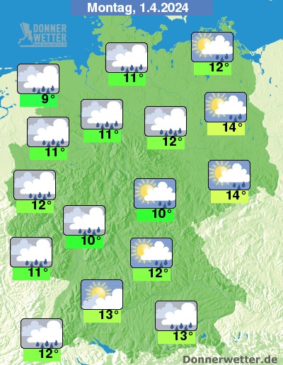 Am Montag ziehen zumeist dichte Wolken durch und nur hier und da sind auch einige Auflockerungen möglich. Im Norden und Osten ist es anfangs noch trocken, sonst bilden sich bereits zeitweise Schauer. Die Temperatur erreicht nur noch 9 Grad an der Nordsee und bis 14 Grad an der Oder. Es weht ein frischer bis starker, in Böen auch oft stürmischer Wind.