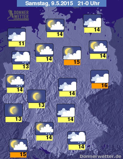 In der Nacht zum Sonntag ziehen im Norden überwiegend dichte Wolken durch und es fällt dabei zeitweise Regen, sonst ist es aufgelockert oder stark bewölkt und im Süden sind gebietsweise Schauer möglich, im übrigen Bundesgebiet bleibt es weitgehend trocken. Die Temperatur sinkt auf 10 Grad in Dresden und bis 7 Grad am Westerwald.