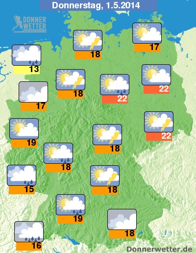 Kurzwetter am DonnerstagAm Feiertag heiter oder wechselnd, örtlich auch dicht bewölkt. Verbreitet Schauer und Gewitter. Im Osten mit Werten um 22 Grad am wärmsten, sonst Höchstwerte um 13 bis 19 Grad.