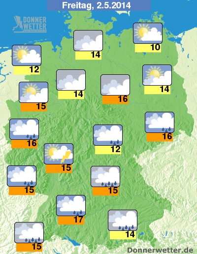 Kurzwetter am FreitagAm Freitag verbreitet wechselnd oder dicht bewölkt mit zeitweiligen Schauern und Gewittern. Häufiger trocken meist nur in der Nordosthälfte, Höchstwerte um 10 bis 17 Grad.