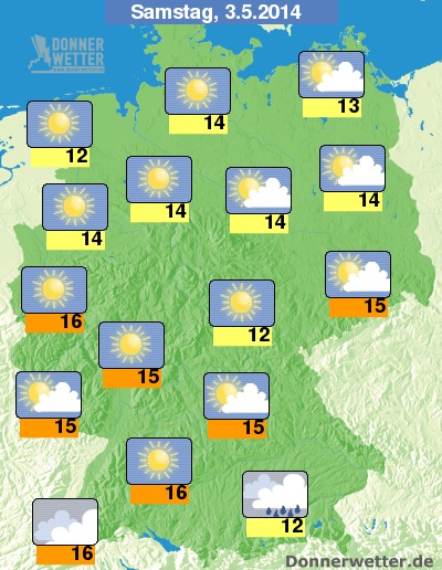 Kurzwetter am SamstagVerbreitet heiter oder sonnig, teils bewölkt, dafür deutlich kühler. Höchstwerte nur noch um 12 bis 16 Grad. Einzelne Schauer am Alpenrand möglich, sonst meist trocken.