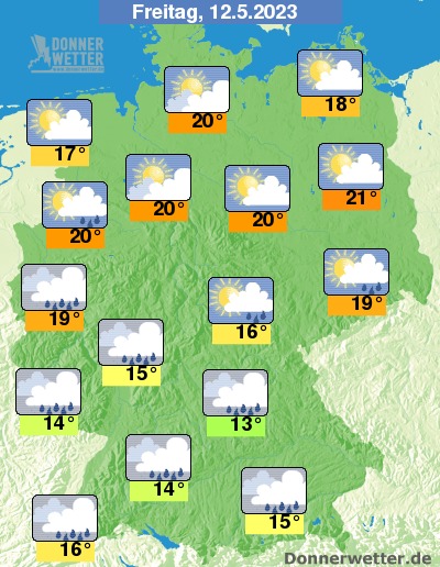Die Temperaturen erreichen Höchstwerte um 13 Grad in Mittelfranken, um 17/18 Grad an den Küsten und 21 Grad an der Spree.