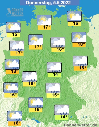 Am Donnerstag ist es aufgelockert bis stark bewölkt, vor allem über der Osthälfte bilden sich häufig Schauer, örtlich auch Gewitter. Über der Westhälfte des Landes bilden sich einzelne Schauer, hier kann sich die Sonne insgesamt etwas häufiger zeigen. Die Temperatur steigt auf 14 Grad im Vogtland und bis 18 Grad im Rheinland.