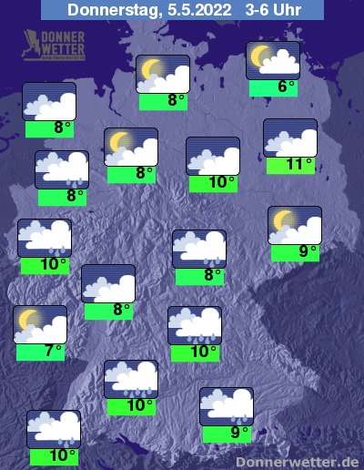 In der bevorstehenden Nacht zeigt sich der Himmel zum Großteil stark bewölkt, hin und wieder sind Auflockerungen möglich. Vor allem im Süden und bis nach Thüringen bilden sich vielerorts Schauer, sonst bilden sich gebietsweise einzelne Schauer, oft bleibt es auch trocken. Die Temperatur sinkt auf 11 Grad im südlichen Brandenburg und 7 Grad im Saargau.