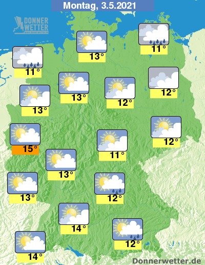 Am Montag ist es wechselnd bis stark bewölkt, teils zeigen sich auch heitere Abschnitte. Im Süden und Norden bilden sich örtliche Schauer, während es sonst weitgehend trocken bleibt. Die Temperatur steigt auf 11 Grad im Grabfeld und bis 15 Grad im Rheinland.