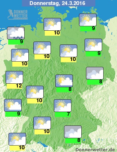Heute ist es vor allem am Vormittag vielerorts heiter oder sogar sonnig, gebietsweise ist es aber auch stärker bewölkt. Am Nachmittag ziehen von Westen her oft einige, teilweise auch dichte Wolken durch, dabei bleibt es jedoch weitgehend trocken. Die Temperatur steigt auf 7 Grad in Mittelfranken und bis 12 Grad in der Kölner Bucht.