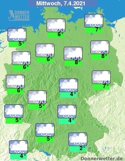 Am Mittwoch zeigen sich vor allem im Norden und Osten einzelne Aufheiterungen, sonst ist es aber häufig stark und nur teils aufgelockert bewölkt. Es bilden sich wiederholt Regen-, Schneeregen-, Schnee-, oder Graupelschauer. Der Wind weht oft stark, zum Teil auch stürmisch. An der Nordsee herrscht verbreitet Sturm. Die Temperatur steigt auf 2 Grad in München und bis 8 Grad in Magdeburg.