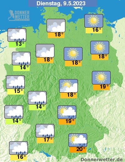 Am Dienstag ist es über der Westhälfte meist bedeckt, zudem ziehen von Westen her Schauer auf. Im weiteren Tagesverlauf fällt dann zeitweise Regen. Dagegen ist es über der Osthälfte weitgehend heiter bis sonnig und trocken. Die Temperatur steigt auf 13 Grad in Cuxhaven und bis 20 Grad in München.