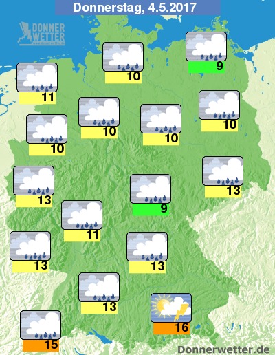 Am Donnerstag zeigt sich der Süden Deutschlands wechselnd bis stark bewölkt, dabei bilden sich hier gebietsweise Schauer und vereinzelt auch Gewitter. In den übrigen Landesteilen ziehen meist dichte Wolken durch und es fällt zeitweise Regen. Die Temperatur steigt auf sehr kühle 9 Grad an der Ostsee und bis 16 Grad in München.