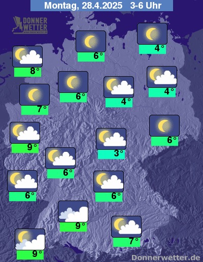 In der Nacht zum Montag lockert es auch im Südwesten meist etwas auf. Ansonsten ist es schon meist nur locker bewölkt, oft sogar sternenklar. Es bleibt landesweit trocken bei Tiefstwerten von 9 Grad in Bonn und etwa 3 Grad in Erfurt.