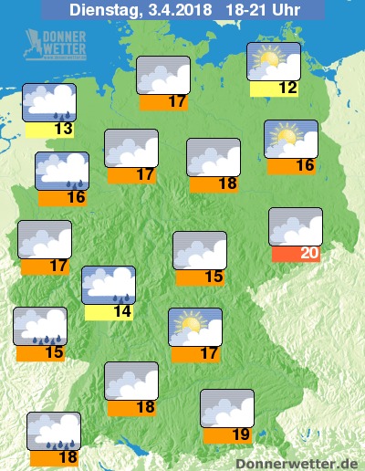 Heute Abend bilden sich über der Westhälfte Deutschlands gebietsweise Schauer, vereinzelt auch Gewitter. Weiter nach Osten hin ist es zwar meist stark, teils auch aufgelockert bewölkt und dazu trocken. Die Temperatur liegt zwischen 12 und 20 Grad.