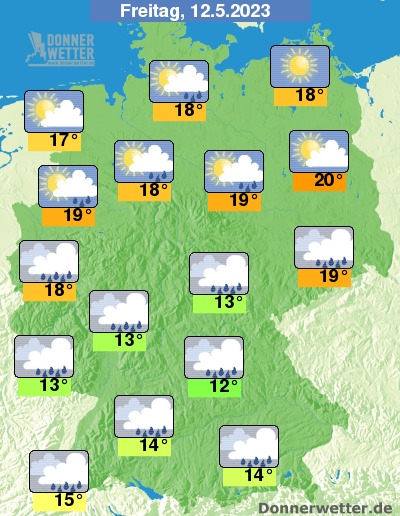 Am Freitag ist es über dem Norden teilweise heiter, teilweise ziehen auch einige Wolken durch, dazu sind einzelne Schauer möglich. Weiter nach Süden hin ziehen dagegen viele und oft dichte Wolken durch, dabei bilden sich gebietsweise Schauer. Die Temperatur steigt auf nasskühle 12 Grad in Mittelfranken und auf deutlich wärmere 20 Grad im Raum Berlin.