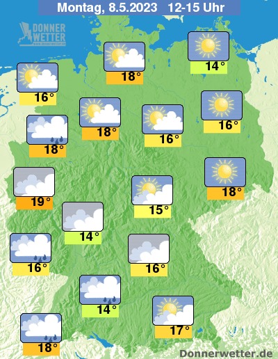 Heute Nachmittag scheint über dem Norden und Osten verbreitet die Sonne von einem teils wolkenlosen und sonst nur locker bewölktem Himmel, dazu bleibt es trocken. Dagegen bringen dichte Wolken vor allem dem Südwesten Schauer und lokal sogar Gewitter. Im Westen und Süden ist es auch oft stark bewölkt, hier sind die Schauer aber etwas seltener. Die Temperatur liegt bei 14 Grad in Neubrandenburg und 19 Grad im Rheinland.