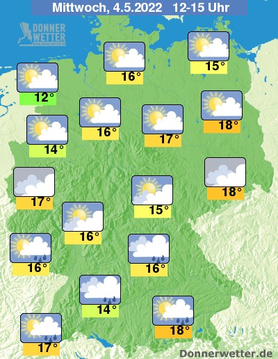 Heute Nachmittag ist es im Süden verbreitet stark, teilweise auch aufgelockert bewölkt, dabei bilden sich gebietsweise Schauer, örtlich sind zudem Gewitter möglich. Im übrigen Bundesgebiet ist es wechselnd bis aufgelockert und nur zum Teil auch stark bewölkt, dabei bleibt es weitgehend trocken. Die Temperatur liegt bei 12 Grad an der Nordsee und etwa 18 Grad in der Lausitz.