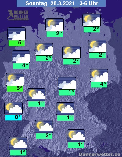 In der folgenden Nacht ist es aufgelockert oder stark bewölkt, im Süden und Südwesten ist es auch zum Teil nur gering bewölkt, dazu bleibt es trocken. Die Temperatur sinkt auf 5 Grad im nördlichen Emsland und bis 0 Grad am Pfälzer Wald.