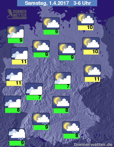 Am Samstag zeigt sich das Wetter in den westlichen Landesteilen meist stark bewölkt, aber auch sonst ziehen zunehmend mehr und auch teils dichte Wolken durch, dabei muss mit einzelnen Schauern gerechnet werden. Örtlich sind sogar Gewitter möglich. Über der Osthälfte und besonders nach Osten hin scheint jedoch auch noch häufig die Sonne. Die Temperatur steigt auf nur noch 11 Grad in Emden und bis etwa 20 Grad in Magdeburg.