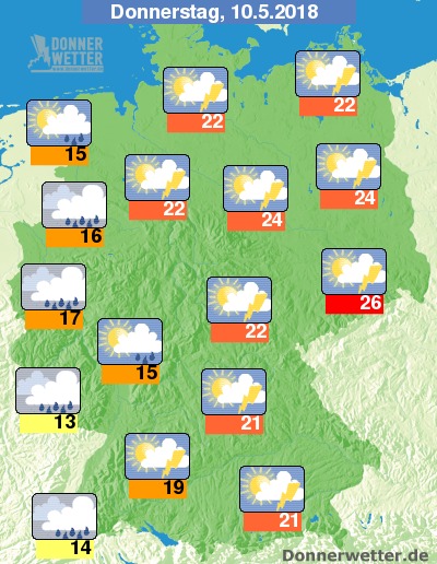 Am Donnerstag zeigen sich im Osten, Nordosten und Norden häufig Aufheiterungen, im übrigen Bundesgebiet ist es zum Teil aufgelockert, teils ist es stark bewölkt, dabei bilden sich zeitweise Schauer, auch Gewitter sind möglich. Die Temperatur steigt nur noch auf kühle 13 Grad am Pfälzer Wald und bis auf schwülwarme 26 Grad in der Lausitz.