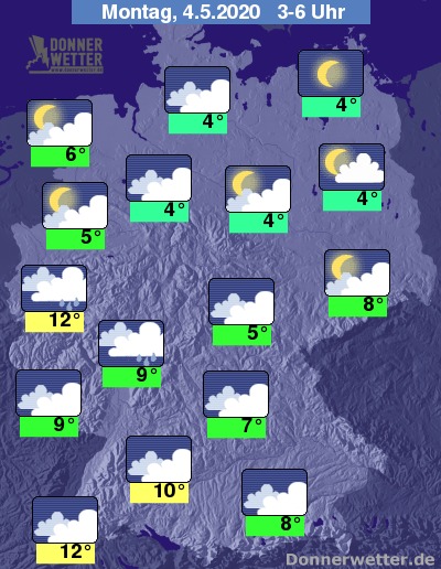 In der folgenden Nacht ist es über dem Norden und Osten oft locker bis aufgelockert bewölkt und dazu trocken. Dagegen bringen kompakte Wolken über der Südwesthälfte Deutschlands auch gebietsweise Regen. Die Temperatur sinkt auf milde 12 Grad entlang des Rheins und bis 4 Grad an der Müritz.