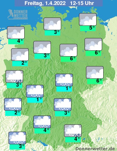 Heute Nachmittag ist es über dem Land bedeckt, dabei fällt über der Südhälfte und vor allem über dem Süden häufig Schnee oder Schneeregen. Über der Nordhälfte bleibt es hingegen weitgehend trocken. Die Temperatur liegt bei 1 Grad am Westerwald und etwa 6 Grad in der Magdeburger Börde.