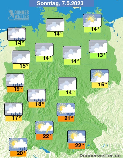 Heute ist es in den westlichen Landesteilen, sowie im Südwesten und äußeren Süden bedeckt und es fällt häufig Regen, örtlich können sich sogar Gewitter entwickeln. Im übrigen Land ist es aufgelockert bis stark bewölkt und dazu weitgehend trocken. Direkt an der Ostsee ist es verbreitet heiter und trocken. Die Temperatur steigt auf 13 Grad an der Oder und bis 22 Grad im Raum München.