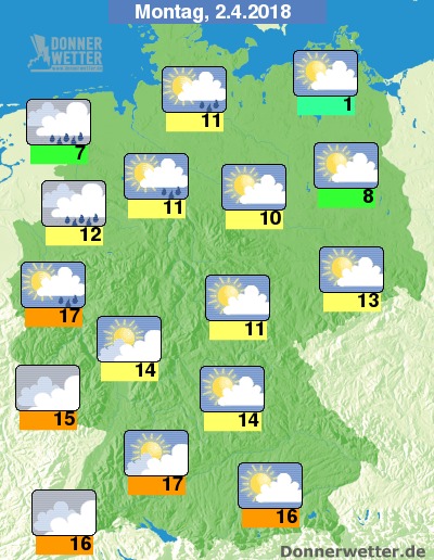 Am Ostermontag ist es häufig locker, wechselnd oder noch aufgelockert bewölkt, nur hier und da bleibt es auch längere Zeit stark bewölkt, dazu bleibt es zunächst trocken. Später zieht von Westen jedoch Regen auf, der sich nach Osten ausbreitet. Die Temperatur steigt auf noch sehr kühle 2 Grad auf Rügen und bis auf frühlingshafte 15 Grad im Breisgau.