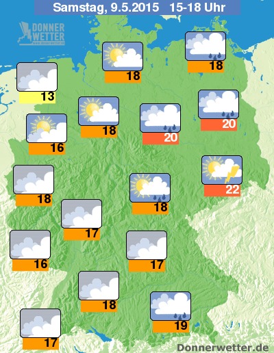 Heute Nachmittag zieht zumeist starke, hier und da aber auch aufgelockerte Bewölkung durch, dabei bilden sich bevorzugt in der Osthälfte des Landes, gebietsweise aber auch im übrigen Bundesgebiet Schauer und regional auch einzelne Gewitter. Die Temperatur liegt bei kühlen 13 Grad an der Nordsee und bis 22 Grad an der Neiße.