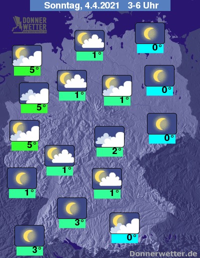 In der Nacht zum Sonntag lockert und klart der Himmel vielerorts auf. Mehr Wolken halten sich vor allem vom Niederrhein bis zur Nordsee und über Thüringen und dem Südosten Bayerns, aber auch hier bleibt es trocken. Die Temperatur sinkt auf 5 Grad an der Ems und bis 0 Grad an der Oder.