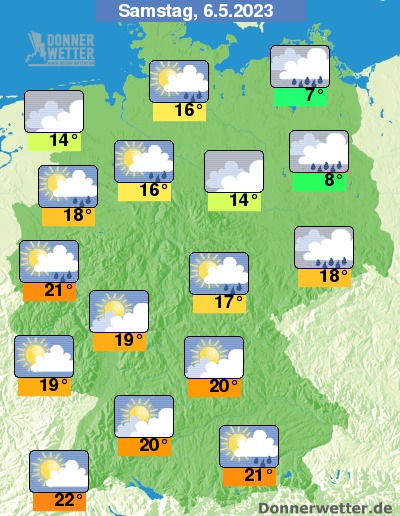 Am Samstag ist es überwiegend stark bewölkt oder bedeckt, gebietsweise zeigen sich aber auch Auflockerungen. Im Nordosten fällt zeitweise Regen, im übrigen Land bilden sich hingegen gebietsweise Schauer. Die Temperatur steigt auf kalte 7 Grad auf Rügen und bis 22 Grad im Breisgau.