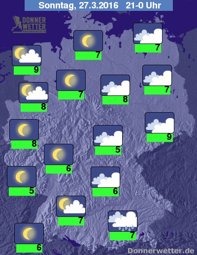 Am Ostermontag nach Osten hin zunächst aufgelockert, teils stark bewölkt und trocken, sonst aus Westen meist dichte Wolken und häufiger, teils kräftiger Regen, teils Schauer und Gewitter, 10 bis 15 Grad, teils sehr windig.