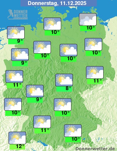 Am Donnerstag zeigt sich der Süden und Norden des Landes teils aufgelockert, zumeist jedoch bedeckt oder trüb. Über der breiten Landesmitte scheint dagegen zeitweise die Sonne, zum Teil ist es sogar heiter. Im Süden können zu Beginn noch letzte Tropfen fallen, im übrigen Land bleibt es aber trocken. Die Temperatur steigt auf 8 Grad im Grabfeld und bis 12 Grad am Oberrhein.