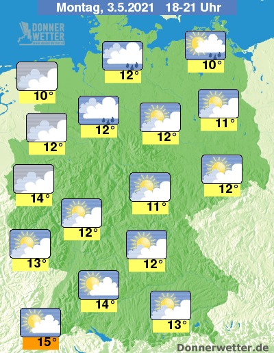 Heute Abend klingen letzte Schauer im Norden nach und nach ab und Auflockerungen werden häufiger, sonst ist es überwiegend aufgelockert, gebietsweise stark bewölkt und es bleibt trocken. Die Temperatur liegt bei 10 Grad in Rostock und bis 15 Grad in Freiburg.