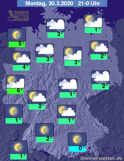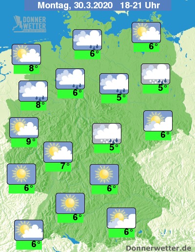 In den Abendstunden bleibt die Wolkendecke mit Ausnahme der Küsten im Norden weitgehend geschlossen. Dabei fällt immer wieder Regen, Schneeregen oder Graupel. Im Süden wechseln sich Sonne und Wolken ab und es bleibt meist trocken.