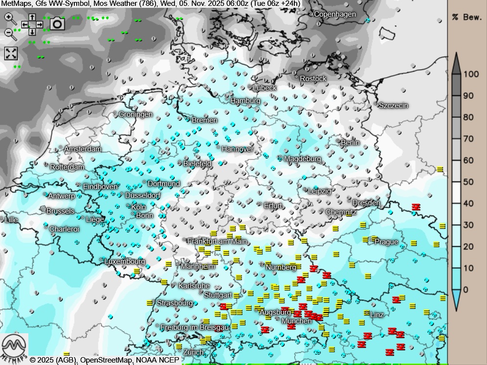 Am Mittwoch zeigt sich der Himmel über dem äußersten Norden wolkig, es bleibt aber trocken. Im Süden kann sich am Mittwoch lokal zäher Nebel halten, teils ist es hier auch ganztägig trüb. Sonst ist es nach Nebelauflösung heiter oder sonnig.