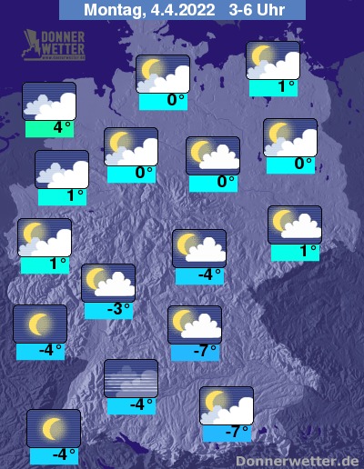 In der Nacht zum Montag ist es im Norden schon oft stark, teils noch aufgelockert bewölkt. Weiter nach Süden hin zeigt sich der Himmel verbreitet locker bewölkt, vor allem im Süden auch sternenklar. Es bleibt zunächst überall trocken. Von Nordwesten nimmt die Bewölkung aber immer weiter zu und gegen Morgen fällt im Nordwesten erster Regen, sonst bleibt es trocken. Die Temperatur sinkt auf 4 Grad an der Nordsee und bis -7 Grad in Mittelfranken.