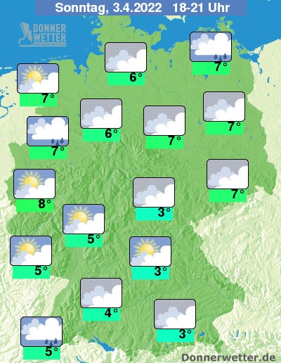Heute Abend ist es im Nordseeumfeld und vom Westen bis nach Nordbayern gebietsweise aufgelockert bewölkt, sonst halten sich weitgehend dichte Wolken und es fällt auch hier und da etwas Regen. Die Temperatur liegt bei 3 Grad in Erfurt und etwa 8 Grad in Köln.