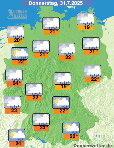 Am Donnerstag bleibt es oft stark bewölkt. Zum Teil ist es auch mal aufgelockert bewölkt, es bilden sich jedoch zeitweise Schauer. Die Höchstwerte erreichen 19 Grad in Stralsund und bis 24 Grad entlang des Rheins.