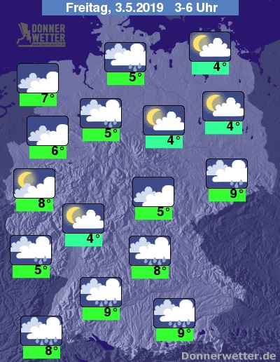 In der Nacht zeigt sich der Himmel über der Nordhälfte überwiegend bedeckt oder aufgelockert bewölkt, im äußersten Nordosten im Verlauf auch locker bewölkt, und es bleibt häufig trocken. Nur entlang der Weser können einzelne Schauer fallen. Im Süden ist es meist bedeckt und immer wieder fällt Regen.
