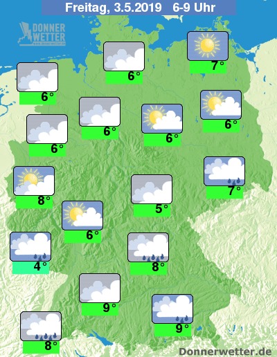 Der Freitag startet in weiten Landesteilen mit einer geschlossenen Wolkendecke, freundlicher ist es in der Frühstunden meist nur östlich der Weser und regional im Westen Deutschlands. Mit örtlichen Schauern muss in den Frühstunden vor allem im Süden gerechnet werden.
