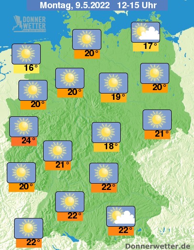 Heute Nachmittag zeigt sich das Land von seiner sehr sonnigen Seite und es ziehen nur hier da wenige, harmlose Wolken durch. Es bleibt trocken bei 16 Grad an der Nordsee und etwa 24 Grad in der Kölner Bucht.