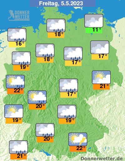 Am Freitag zeigt sich das Wetter verbreitet stark oder dicht bewölkt, nur hin und wieder sind auch Auflockerungen möglich. Es bilden sich vielerorts Schauer, örtlich sind sogar Gewitter möglich. Die Temperatur erreicht 11 Grad an der Ostsee und bis 22 Grad im Raum München.