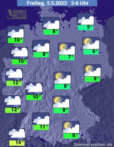 In der Nacht zum Freitag zieht von Westen he eine Schauerfront in die westlichen Landesteile, vereinzelt sind dabei auch kurze Gewitter möglich. Im übrigen Land ist es auch oft stark, teils aber auch aufgelockert bewölkt, dazu bleibt es trocken. Die Temperatur sinkt auf milde 14 Grad in Freiburg und bis 5 Grad in Neubrandenburg.