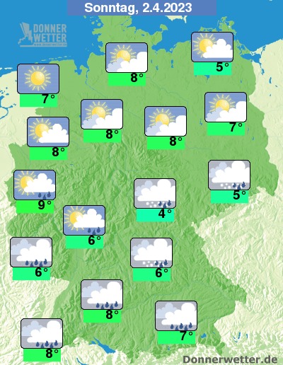 Am Sonntag bleibt es über dem Süden weitgehend bedeckt und es fällt hier zeitweise Regen, teilweise auch Schnee oder Schneeregen. Im übrigen Land ist es anfangs oft stark bewölkt, von Norden heitert der Himmel jedoch immer weiter auf, dazu bleibt es trocken. Die Temperatur steigt auf 4 Grad im Vogtland und bis 9 Grad im Rheinland.
