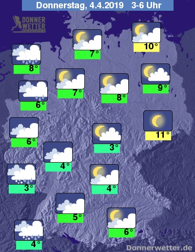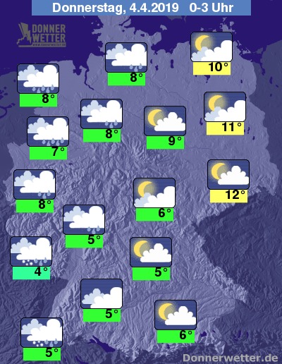 In den Nachtstunden zeigt sich der Himmel über der Westhälfte des Landes überwiegend bedeckt, dabei muss immer wieder mit Regen-, im Südwesten auch Schneeregen- oder Schneeschauern, gerechnet werden. In der Osthälfte ist es locker oder aufgelockert bewölkt und es bleibt meist trocken.