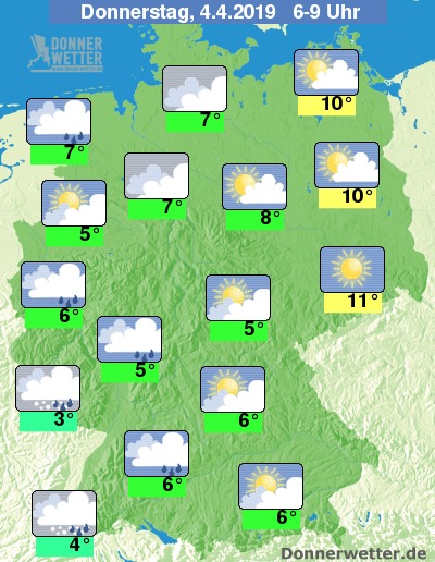 Auch der Donnerstagmorgen startet zweigeteilt: Während im Westen eine geschlossene Wolkendecke bei zeitweiligen Schauern, im Südwesten auch Schneeschauern, überwiegt, beginnt der Tag im Osten mit einem trockenen Mix aus Sonne und Wolken.